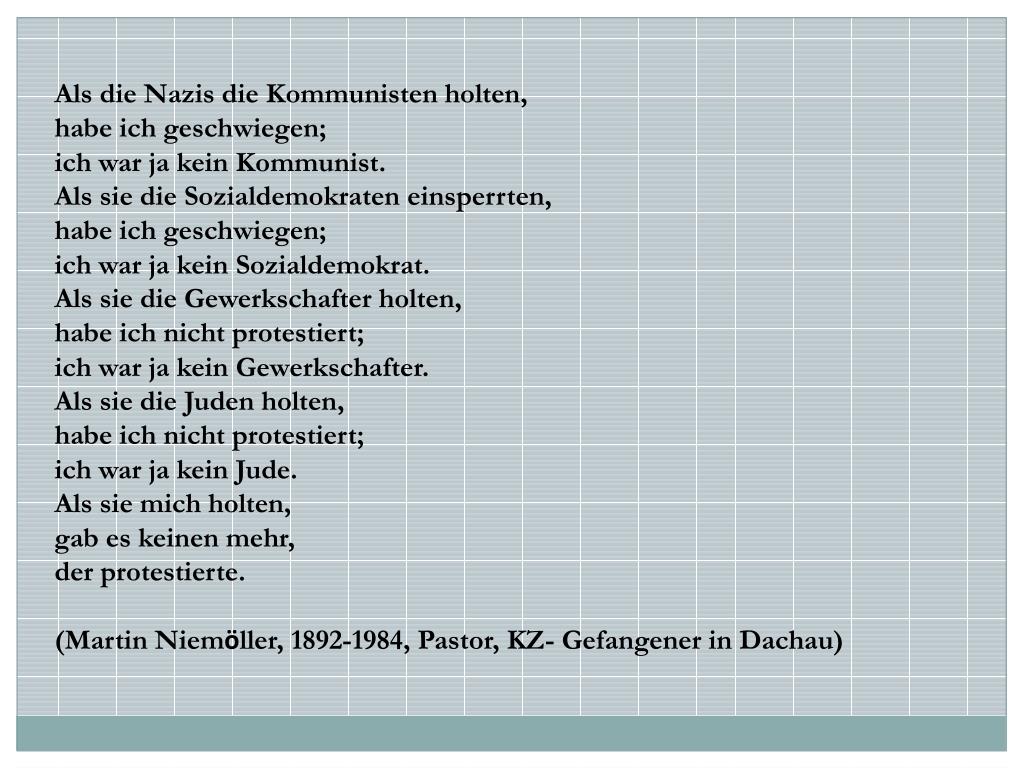 Als die Nazis die Kommunisten holten,habe ich geschwiegen;ich war ja kein Kommunist. Als sie die Sozialdemokraten einsperrten,habe ich geschwiegen;ich war ja kein Sozialdemokrat. Als sie die Gewerkschafter holten,habe ich nicht protestiert;ich war ja kein Gewerkschafter. Als sie die Juden holten,habe ich nicht protestiert;ich war ja kein Jude. Als sie mich holten,gab es keinen mehr, der protestierte. (Martin Niemöller, 1892-1984, Pastor, KZ- Gefangener in Dachau)
