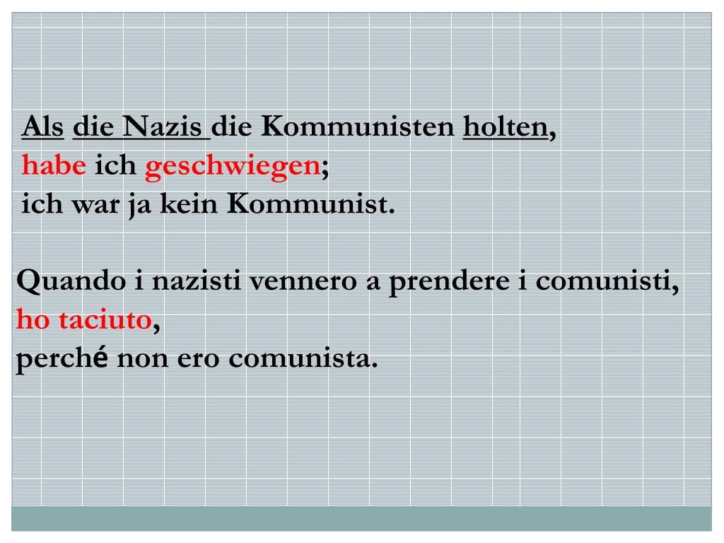 Alsdie Nazis die Kommunisten holten,habe ich geschwiegen;ich war ja kein Kommunist. Quando i nazisti vennero a prendere i comunisti, ho taciuto, perché non ero comunista.