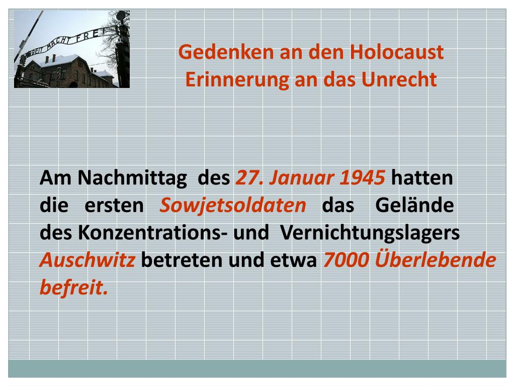Gedenken an den Holocaust Erinnerung an das Unrecht Am Nachmittag des 27. Januar 1945 hatten die ersten Sowjetsoldaten das Gelände des Konzentrations- und Vernichtungslagers Auschwitz betreten und etwa 7000 Überlebende befreit.