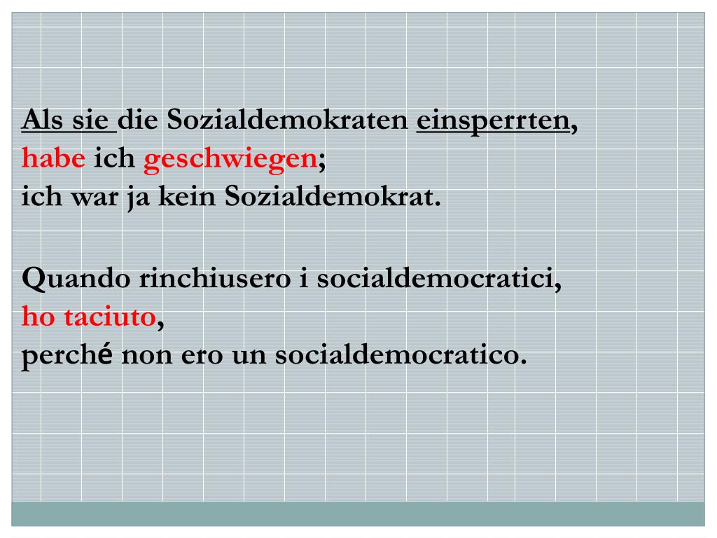 Als sie die Sozialdemokraten einsperrten,habe ich geschwiegen;ich war ja kein Sozialdemokrat. Quando rinchiusero i socialdemocratici, ho taciuto, perché non ero un socialdemocratico.
