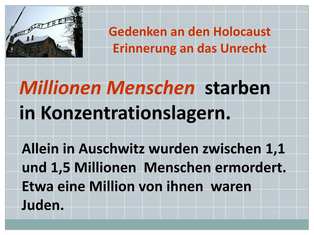 Gedenken an den Holocaust Erinnerung an das Unrecht Millionen Menschen starben in Konzentrationslagern. Allein in Auschwitz wurden zwischen 1,1 und 1,5 Millionen Menschen ermordert. Etwa eine Million von ihnen waren Juden.