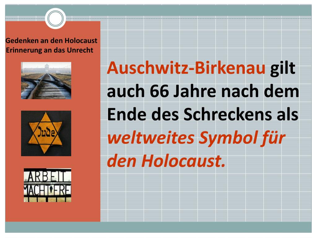 Gedenken an den Holocaust Erinnerung an das Unrecht Auschwitz-Birkenau gilt auch 66 Jahre nach dem Ende des Schreckens als weltweites Symbol für den Holocaust.