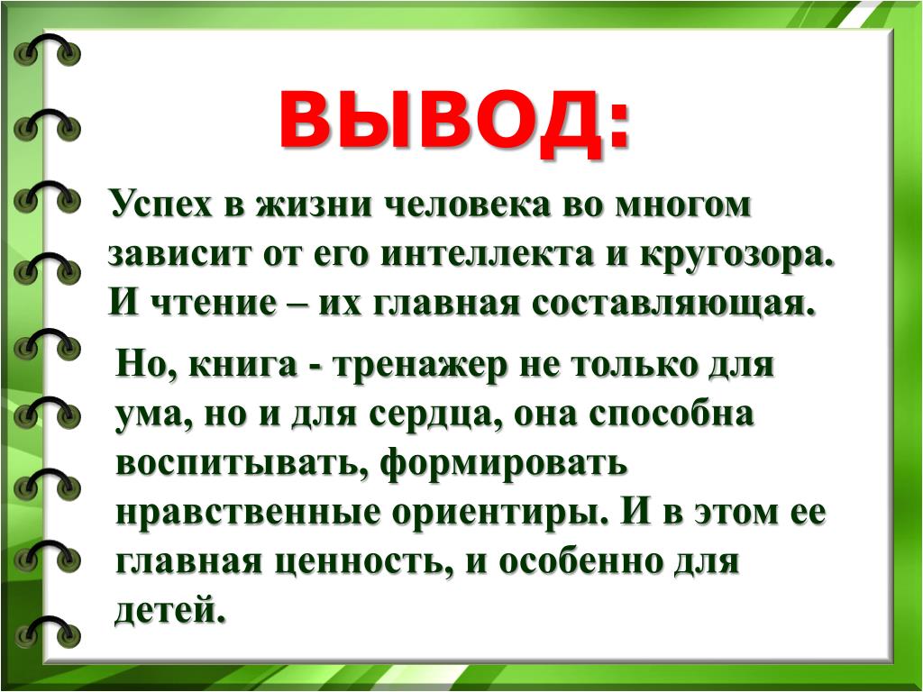 ВЫВОД: Успех в жизни человека во многом зависит от его интеллекта и кругозора. И чтение – их главная составляющая. Но, книга - тренажер не только для ума, но и для сердца, она способна воспитывать, формировать нравственные ориентиры. И в этом ее главная ценность, и особенно для детей.