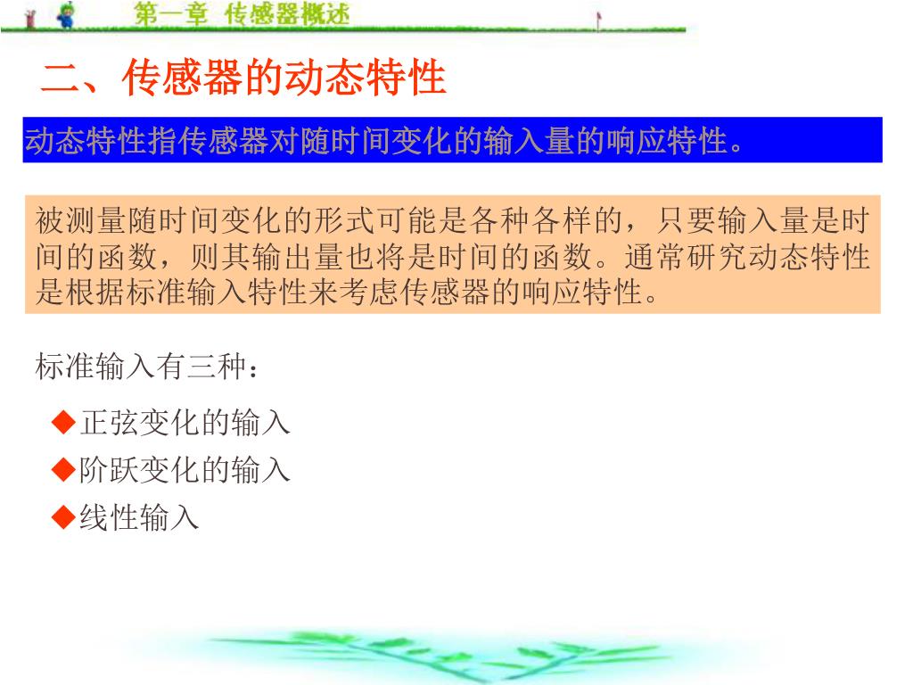 二、传感器的动态特性 动态特性指传感器对随时间变化的输入量的响应特性。 被测量随时间变化的形式可能是各种各样的,只要输入量是时间的函数,则其输出量也将是时间的函数。通常研究动态特性是根据标准输入特性来考虑传感器的响应特性。 标准输入有三种: • 正弦变化的输入 • 阶跃变化的输入 • 线性输入