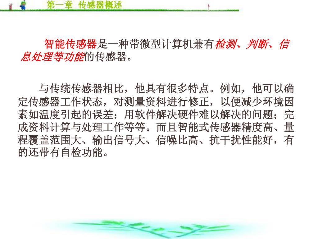 智能传感器是一种带微型计算机兼有检测、判断、信息处理等功能的传感器。智能传感器是一种带微型计算机兼有检测、判断、信息处理等功能的传感器。 与传统传感器相比,他具有很多特点。例如,他可以确定传感器工作状态,对测量资料进行修正,以便减少环境因素如温度引起的误差;用软件解决硬件难以解决的问题;完成资料计算与处理工作等等。而且智能式传感器精度高、量程覆盖范围大、输出信号大、信噪比高、抗干扰性能好,有的还带有自检功能。