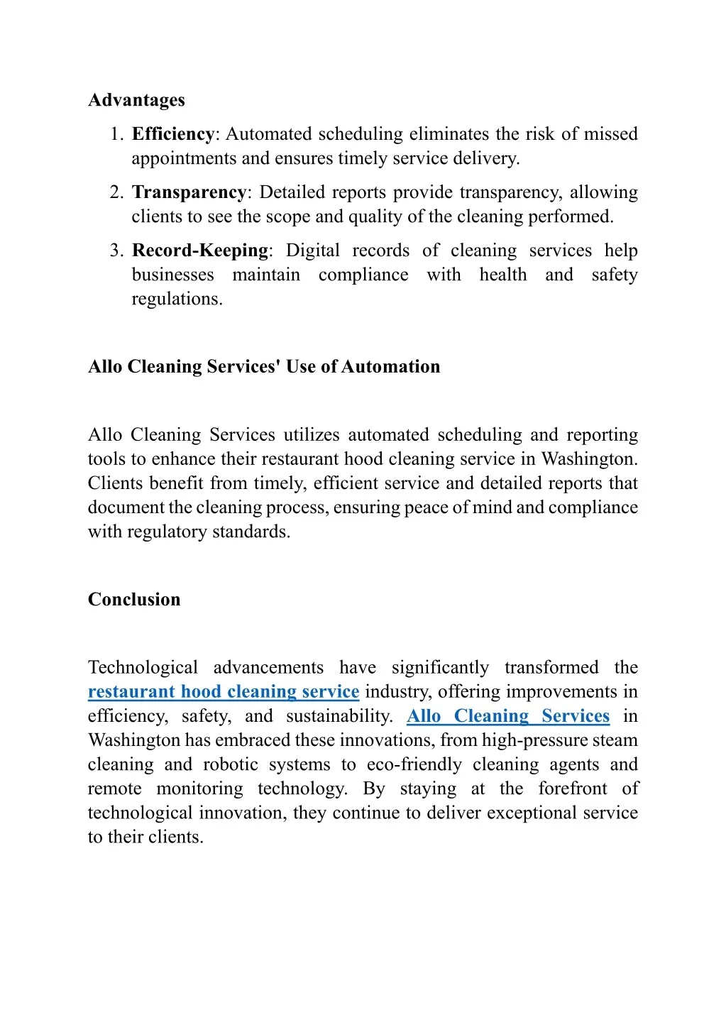 Advantages 1.Efficiency: Automated scheduling eliminates the risk of missed appointments and ensures timely service delivery. 2.Transparency: Detailed reports provide transparency, allowing clients to see the scope and quality of the cleaning performed. 3.Record-Keeping: Digital records of cleaning services help businesses maintain compliance with health and safety regulations. Allo Cleaning Services' Use of Automation Allo Cleaning Services utilizes automated scheduling and reporting tools to enhance their restaurant hood cleaning service in Washington. Clients benefit from timely, efficient service and detailed reports that document the cleaning process, ensuring peace of mind and compliance with regulatory standards. Conclusion Technological advancements have significantly transformed the restaurant hood cleaning service industry, offering improvements in efficiency, safety, and sustainability. Allo Cleaning Services in Washington has embraced these innovations, from high-pressure steam cleaning and robotic systems to eco-friendly cleaning agents and remote monitoring technology. By staying at the forefront of technological innovation, they continue to deliver exceptional service to their clients.