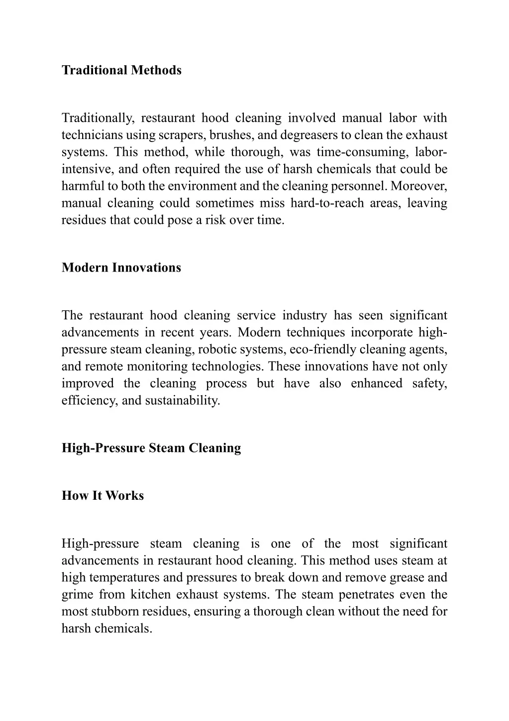 Traditional Methods Traditionally, restaurant hood cleaning involved manual labor with technicians using scrapers, brushes, and degreasers to clean the exhaust systems. This method, while thorough, was time-consuming, labor- intensive, and often required the use of harsh chemicals that could be harmful to both the environment and the cleaning personnel. Moreover, manual cleaning could sometimes miss hard-to-reach areas, leaving residues that could pose a risk over time. Modern Innovations The restaurant hood cleaning service industry has seen significant advancements in recent years. Modern techniques incorporate high- pressure steam cleaning, robotic systems, eco-friendly cleaning agents, and remote monitoring technologies. These innovations have not only improved the cleaning process but have also enhanced safety, efficiency, and sustainability. High-Pressure Steam Cleaning How It Works High-pressure steam cleaning is one of the most significant advancements in restaurant hood cleaning. This method uses steam at high temperatures and pressures to break down and remove grease and grime from kitchen exhaust systems. The steam penetrates even the most stubborn residues, ensuring a thorough clean without the need for harsh chemicals.