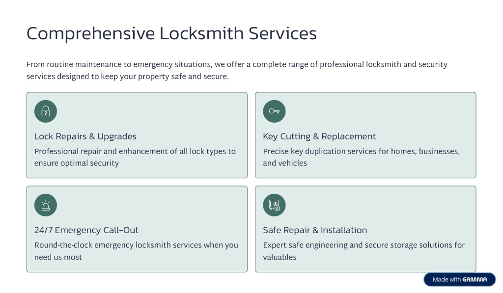 Comprehensive Locksmith Services From routine maintenance to emergency situations, we offer a complete range of professional locksmith and security services designed to keep your property safe and secure. Lock Repairs & Upgrades Professional repair and enhancement of all lock types to ensure optimal security Key Cutting & Replacement Precise key duplication services for homes, businesses, and vehicles 24/7 Emergency Call-Out Round-the-clock emergency locksmith services when you need us most Safe Repair & Installation Expert safe engineering and secure storage solutions for valuables