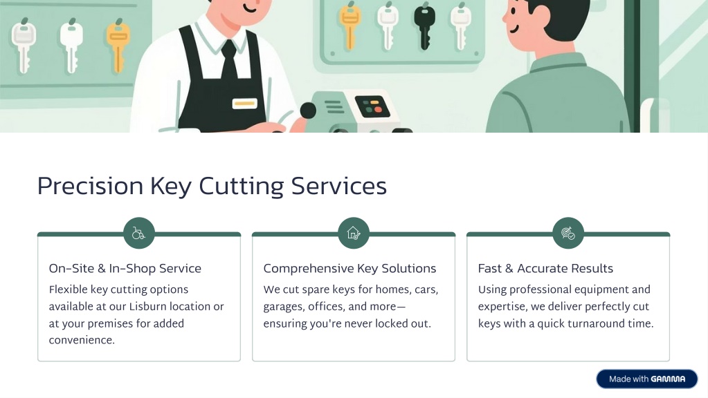Precision Key Cutting Services On-Site & In-Shop Service Flexible key cutting options available at our Lisburn location or at your premises for added convenience. Comprehensive Key Solutions We cut spare keys for homes, cars, garages, offices, and more4 ensuring you're never locked out. Fast & Accurate Results Using professional equipment and expertise, we deliver perfectly cut keys with a quick turnaround time.