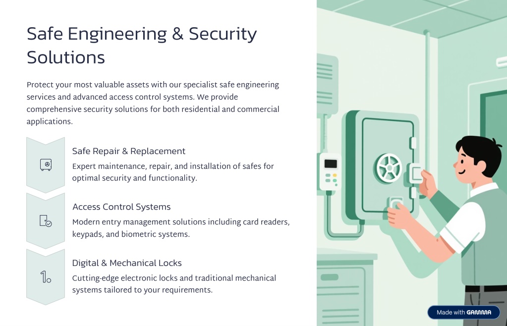 Safe Engineering & Security Solutions Protect your most valuable assets with our specialist safe engineering services and advanced access control systems. We provide comprehensive security solutions for both residential and commercial applications. Safe Repair & Replacement Expert maintenance, repair, and installation of safes for optimal security and functionality. Access Control Systems Modern entry management solutions including card readers, keypads, and biometric systems. Digital & Mechanical Locks Cutting-edge electronic locks and traditional mechanical systems tailored to your requirements.