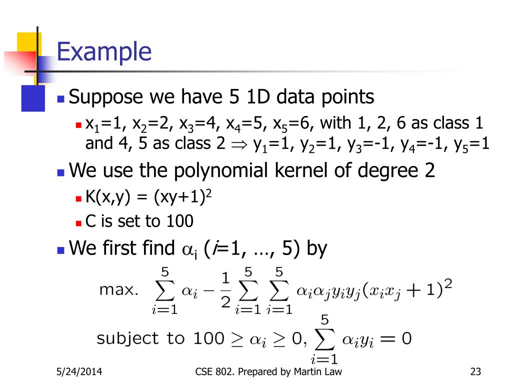 Example • Suppose we have 5 1D data points • x1=1, x2=2, x3=4, x4=5, x5=6, with 1, 2, 6 as class 1 and 4, 5 as class 2 y1=1, y2=1, y3=-1, y4=-1, y5=1 • We use the polynomial kernel of degree 2 • K(x,y) = (xy+1)2 • C is set to 100 • We first find ai (i=1, …, 5) by CSE 802. Prepared by Martin Law