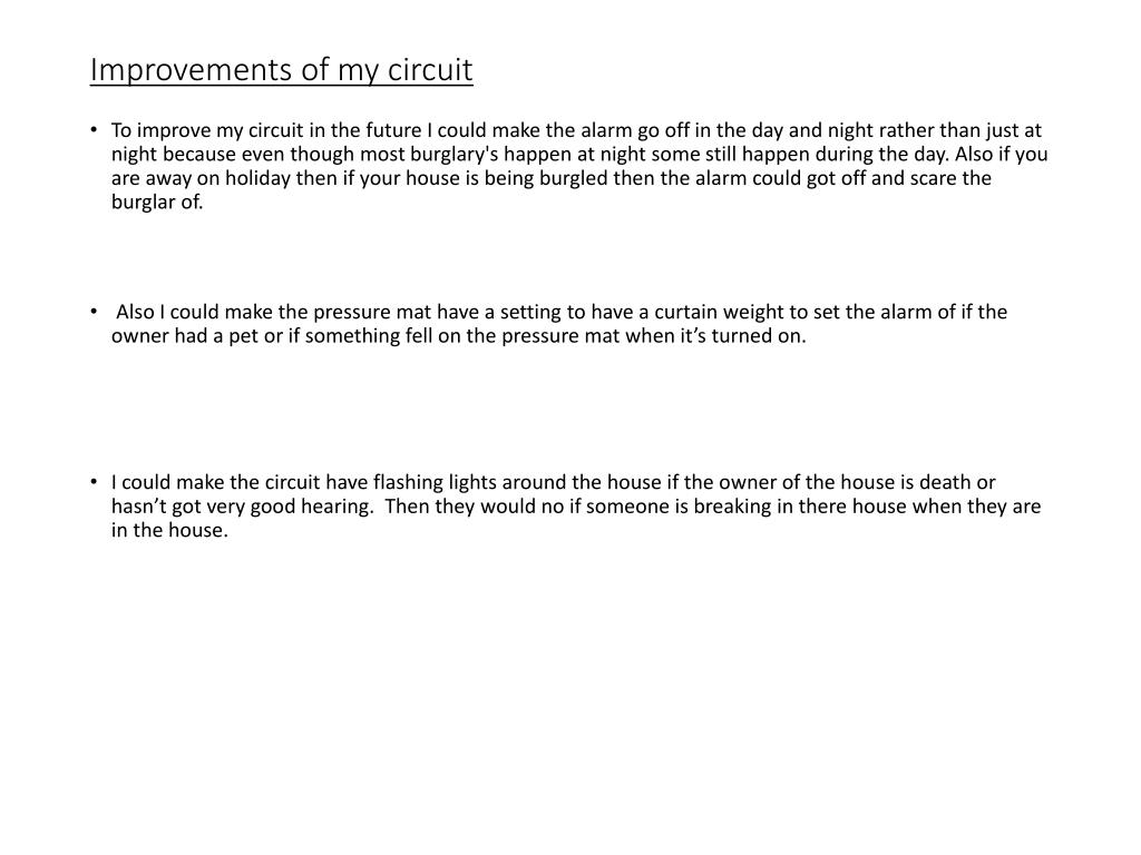 Improvements of my circuit • To improve my circuit in the future I could make the alarm go off in the day and night rather than just at night because even though most burglary's happen at night some still happen during the day. Also if you are away on holiday then if your house is being burgled then the alarm could got off and scare the burglar of. • Also I could make the pressure mat have a setting to have a curtain weight to set the alarm of if the owner had a pet or if something fell on the pressure mat when it’s turned on. • I could make the circuit have flashing lights around the house if the owner of the house is death or hasn’t got very good hearing. Then they would no if someone is breaking in there house when they are in the house.