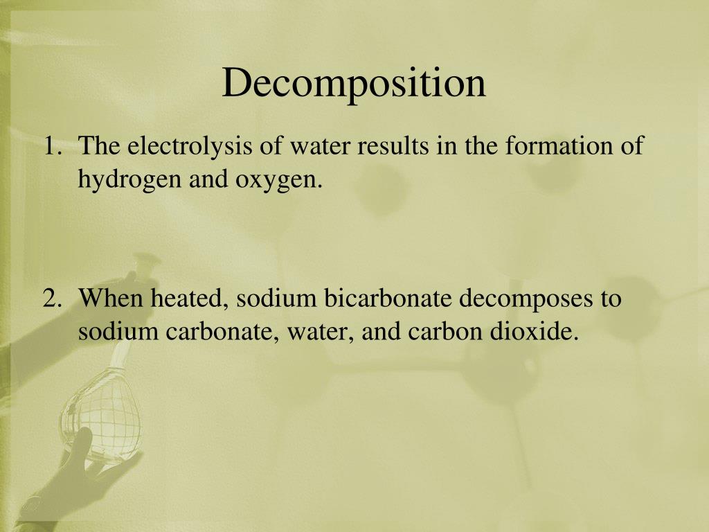 Decomposition • The electrolysis of water results in the formation of hydrogen and oxygen. • When heated, sodium bicarbonate decomposes to sodium carbonate, water, and carbon dioxide.