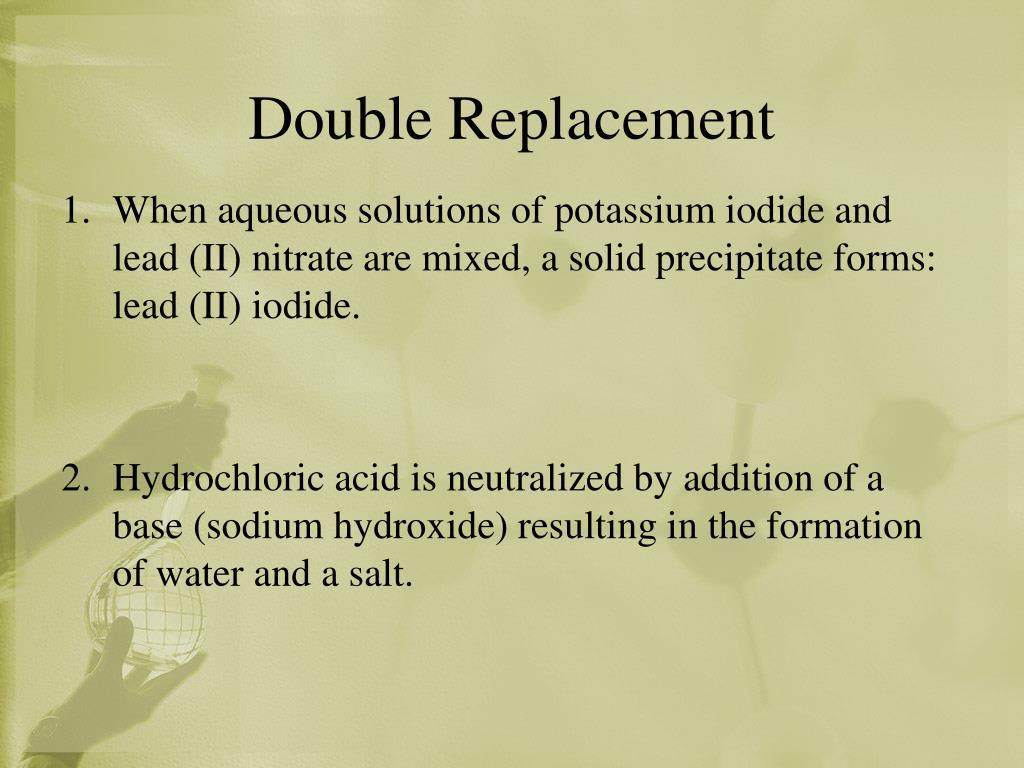 Double Replacement • When aqueous solutions of potassium iodide and lead (II) nitrate are mixed, a solid precipitate forms: lead (II) iodide. • Hydrochloric acid is neutralized by addition of a base (sodium hydroxide) resulting in the formation of water and a salt.