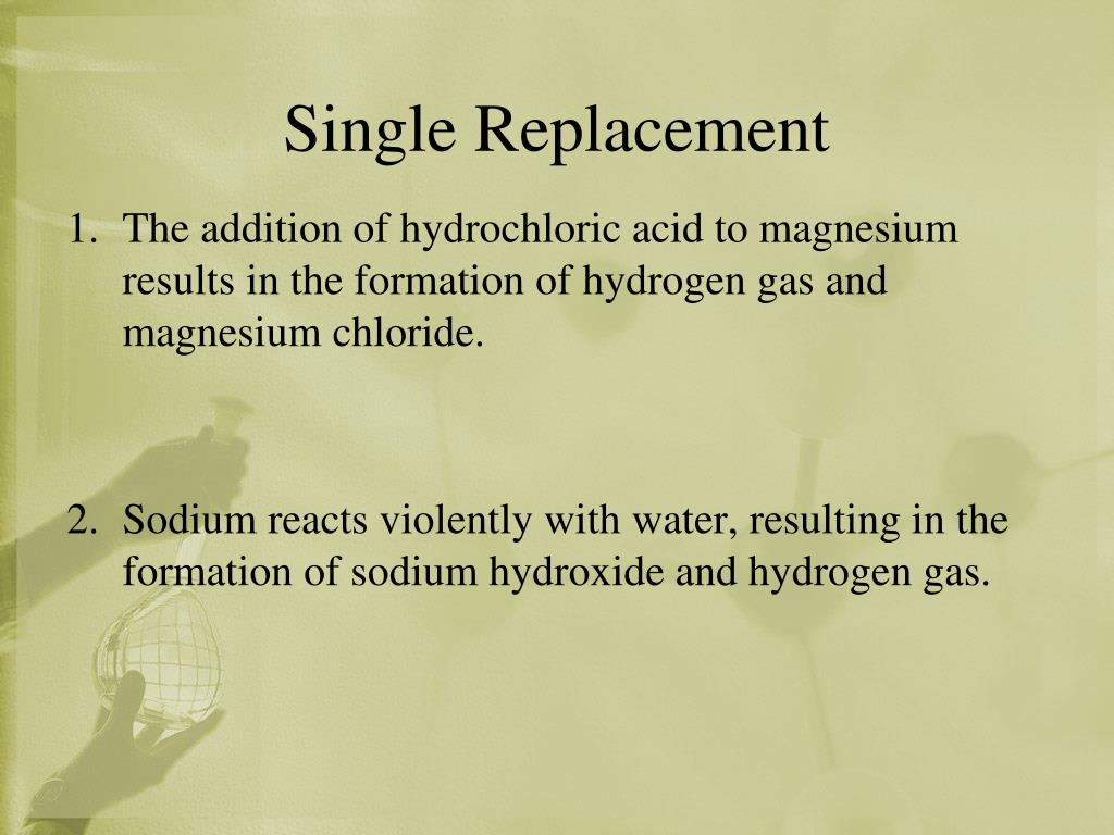 Single Replacement • The addition of hydrochloric acid to magnesium results in the formation of hydrogen gas and magnesium chloride. • Sodium reacts violently with water, resulting in the formation of sodium hydroxide and hydrogen gas.