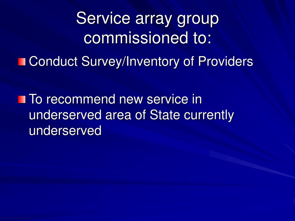 Service array group commissioned to: • Conduct Survey/Inventory of Providers • To recommend new service in underserved area of State currently underserved