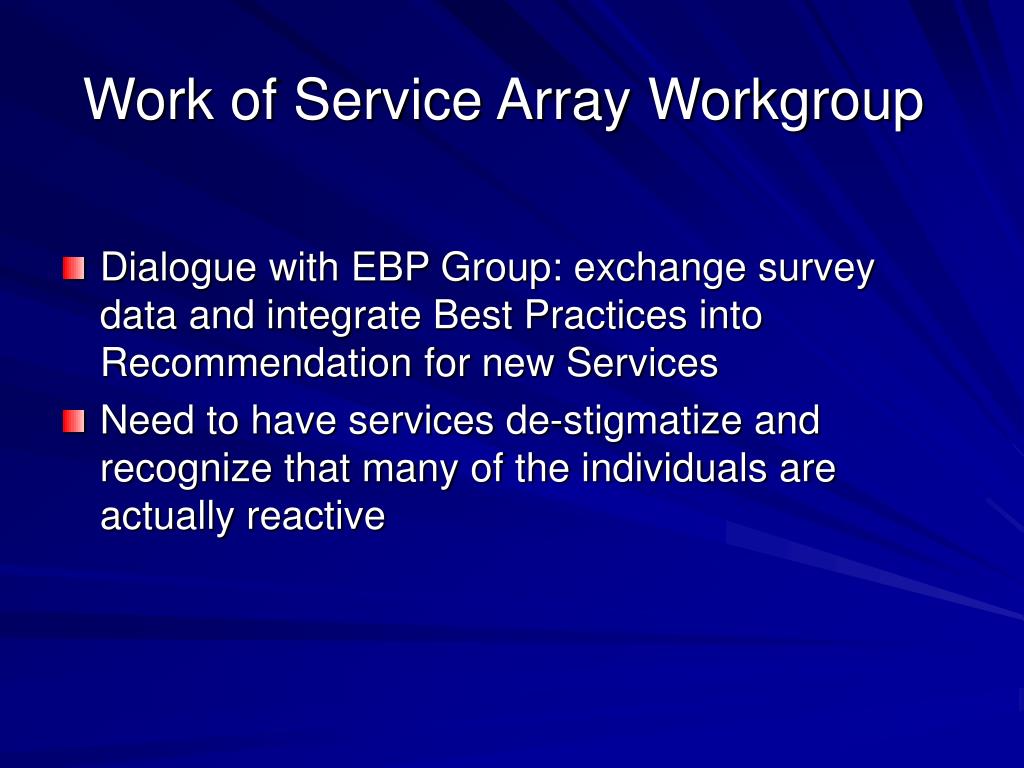 Work of Service Array Workgroup • Dialogue with EBP Group: exchange survey data and integrate Best Practices into Recommendation for new Services • Need to have services de-stigmatize and recognize that many of the individuals are actually reactive