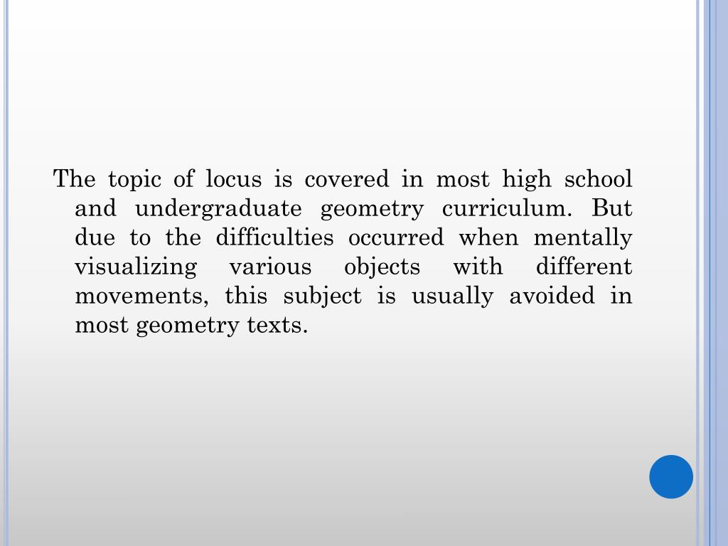The topic of locus is covered in most high school and undergraduate geometry curriculum. But due to the difficulties occurred when mentally visualizing various objects with different movements, this subject is usually avoided in most geometry texts.