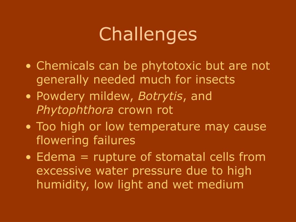 Challenges • Chemicals can be phytotoxic but are not generally needed much for insects • Powdery mildew, Botrytis, and Phytophthora crown rot • Too high or low temperature may cause flowering failures • Edema = rupture of stomatal cells from excessive water pressure due to high humidity, low light and wet medium