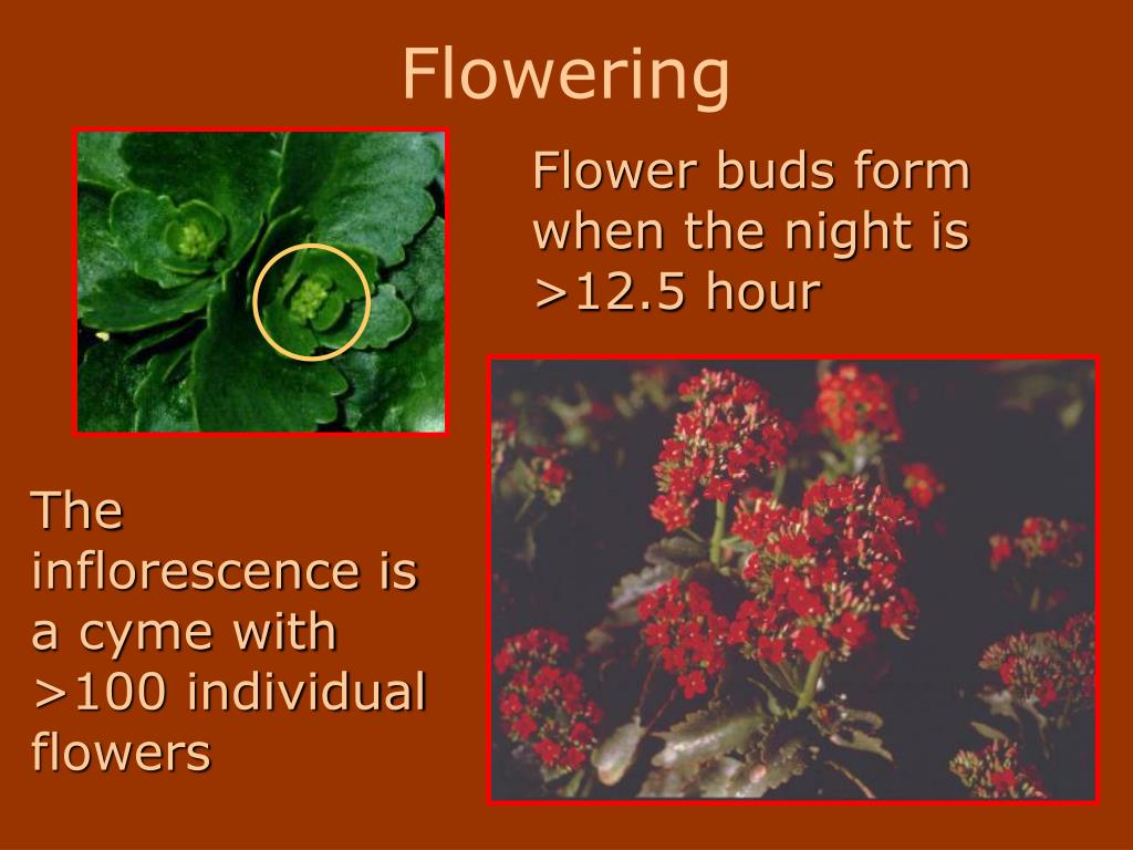 Flowering Flower buds form when the night is >12.5 hour The inflorescence is a cyme with >100 individual flowers