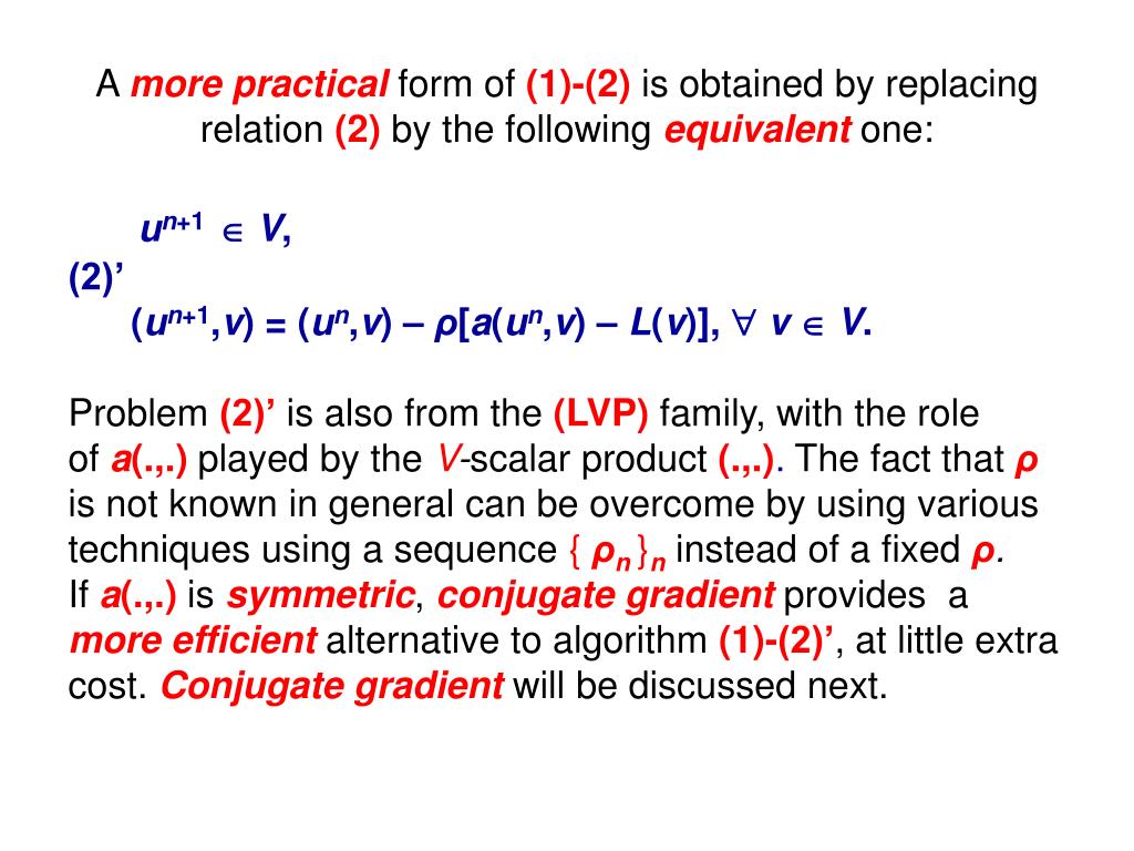 A more practical form of (1)-(2) is obtained by replacing relation (2) by the following equivalent one: un+1 V, (2)’ (un+1,v) = (un,v) – ρ[a(un,v) – L(v)], v V. Problem(2)’is also from the(LVP)family, with the role ofa(.,.)played by the V-scalar product(.,.). The fact thatρ is not known in general can be overcome by using various techniques using a sequence { ρn }n instead of a fixed ρ. If a(.,.) is symmetric, conjugate gradient provides a more efficient alternative to algorithm (1)-(2)’, at little extra cost. Conjugate gradient will be discussed next.