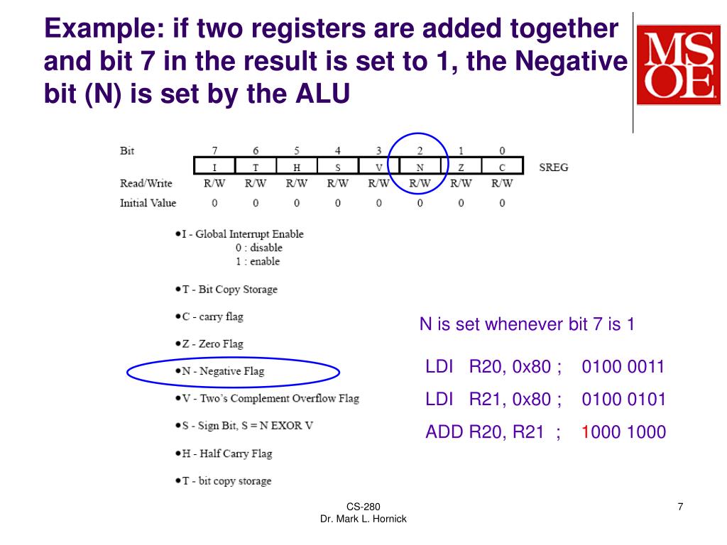 Example: if two registers are added together and bit 7 in the result is set to 1, the Negative bit (N) is set by the ALU N is set whenever bit 7 is 1 LDI R20, 0x80 ; 0100 0011 LDI R21, 0x80 ; 0100 0101 ADD R20, R21 ; 1000 1000 CS-280 Dr. Mark L. Hornick