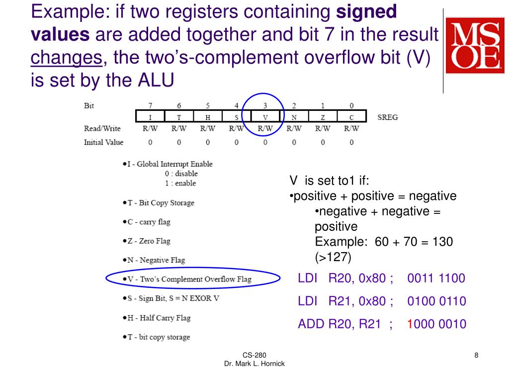 Example: if two registers containing signed values are added together and bit 7 in the result changes, the two’s-complement overflow bit (V) is set by the ALU • V is set to1 if: • positive + positive = negative • negative + negative = positive • Example: 60 + 70 = 130 (>127) LDI R20, 0x80 ; 0011 1100 LDI R21, 0x80 ; 0100 0110 ADD R20, R21 ; 1000 0010 CS-280 Dr. Mark L. Hornick