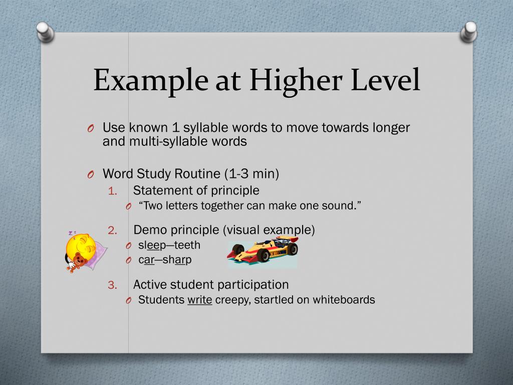 Example at Higher Level • Use known 1 syllable words to move towards longer and multi-syllable words • Word Study Routine (1-3 min) • Statement of principle • “Two letters together can make one sound.” • Demo principle (visual example) • sleep—teeth • car—sharp • Active student participation • Students write creepy, startled on whiteboards