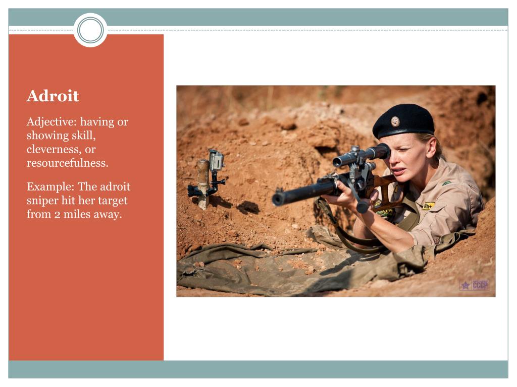 Adroit Adjective: having or showing skill, cleverness, or resourcefulness. Example: The adroit sniper hit her target from 2 miles away.