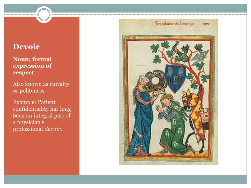 Devoir Noun: formal expression of respect Also known as chivalry or politeness. Example: Patient confidentiality has long been an integral part of a physician's professional devoir.