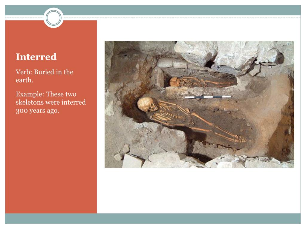 Interred Verb: Buried in the earth. Example: These two skeletons were interred 300 years ago.