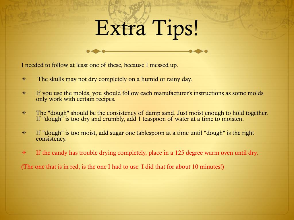 Extra Tips! I needed to follow at least one of these, because I messed up. The skulls may not dry completely on a humid or rainy day. If you use the molds, you should follow each manufacturer's instructions as some molds only work with certain recipes. The "dough" should be the consistency of damp sand. Just moist enough to hold together. If "dough" is too dry and crumbly, add 1 teaspoon of water at a time to moisten. If "dough" is too moist, add sugar one tablespoon at a time until "dough" is the right consistency. If the candy has trouble drying completely, place in a 125 degree warm oven until dry. (The one that is in red, is the one I had to use. I did that for about 10 minutes!)