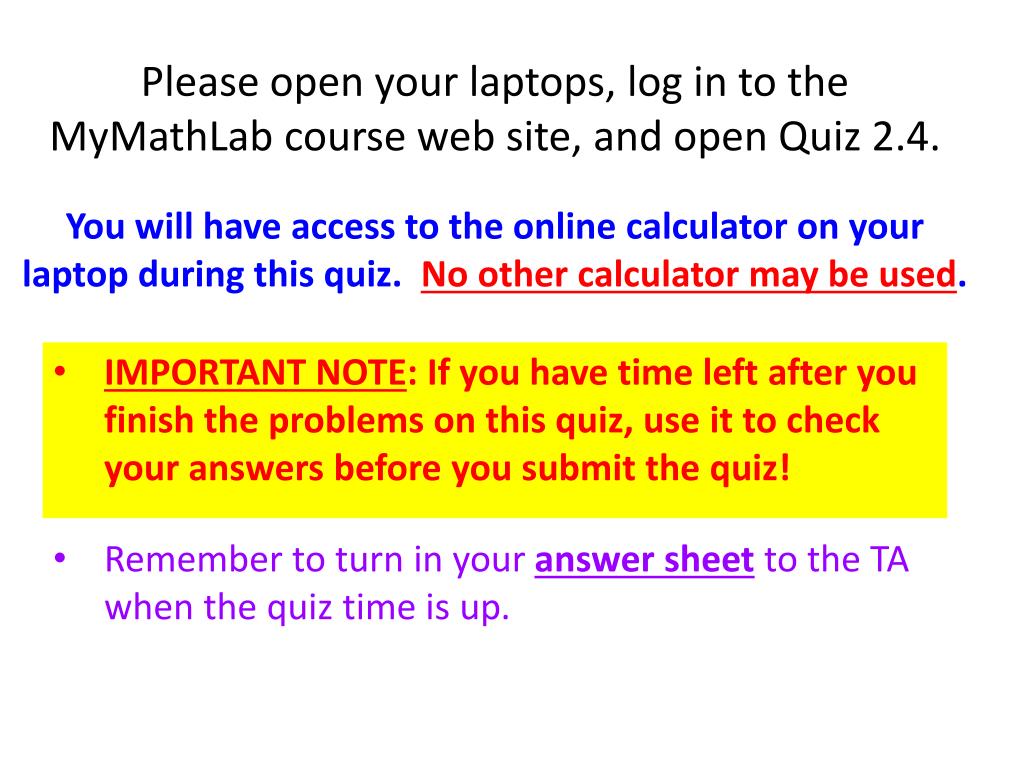 You will have access to the online calculator on your laptop during this quiz. No other calculator may be used . Please open your laptops, log in to the MyMathLab course web site, and open Quiz 2.4.