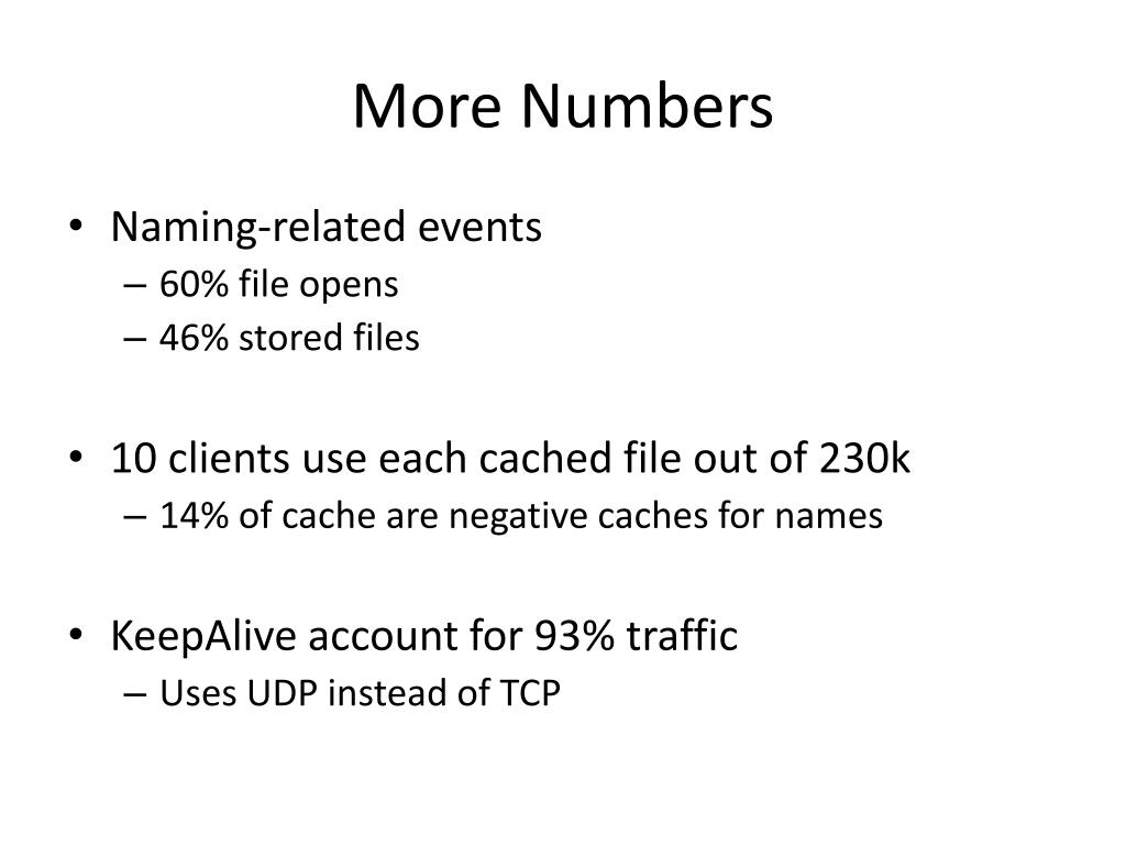 More Numbers • Naming-related events • 60% file opens • 46% stored files • 10 clients use each cached file out of 230k • 14% of cache are negative caches for names • KeepAlive account for 93% traffic • Uses UDP instead of TCP
