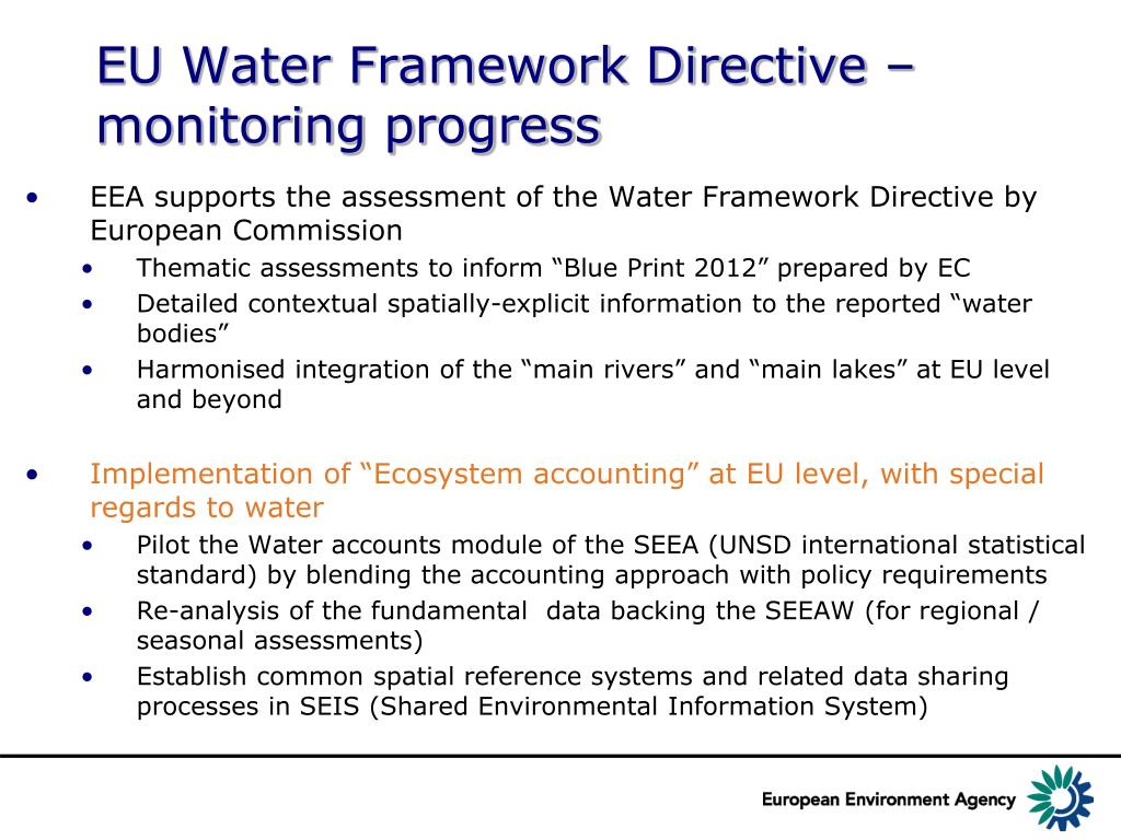 EU Water Framework Directive: Environnemental accounting and SEIS. State of the art (NB: adapted and completed from J McGlade presentation at the WWF, Marseille, 13 march 2012). EU Water Framework Directive –monitoring progress.