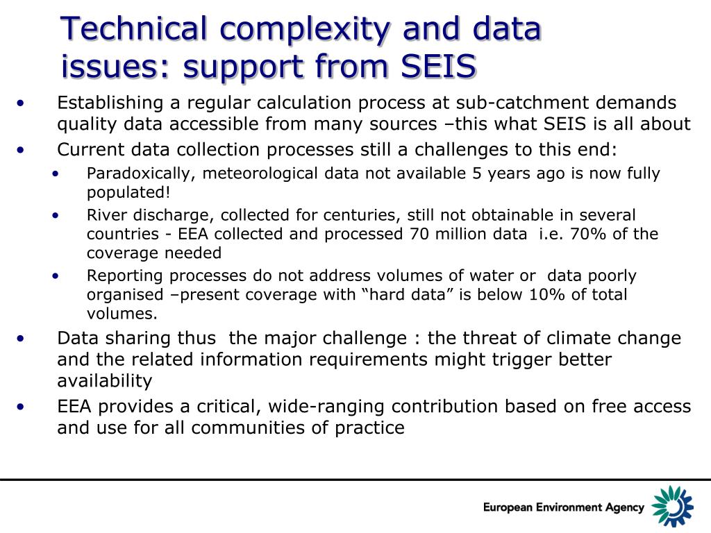 Technical complexity and data issues: support from SEIS • Establishing a regular calculation process at sub-catchment demands quality data accessible from many sources –this what SEIS is all about • Current data collection processes still a challenges to this end: • Paradoxically, meteorological data not available 5 years ago is now fully populated! • River discharge, collected for centuries, still not obtainable in several countries - EEA collected and processed 70 million data i.e. 70% of the coverage needed • Reporting processes do not address volumes of water or data poorly organised –present coverage with “hard data” is below 10% of total volumes. • Data sharing thus the major challenge : the threat of climate change and the related information requirements might trigger better availability • EEA provides a critical, wide-ranging contribution based on free access and use for all communities of practice