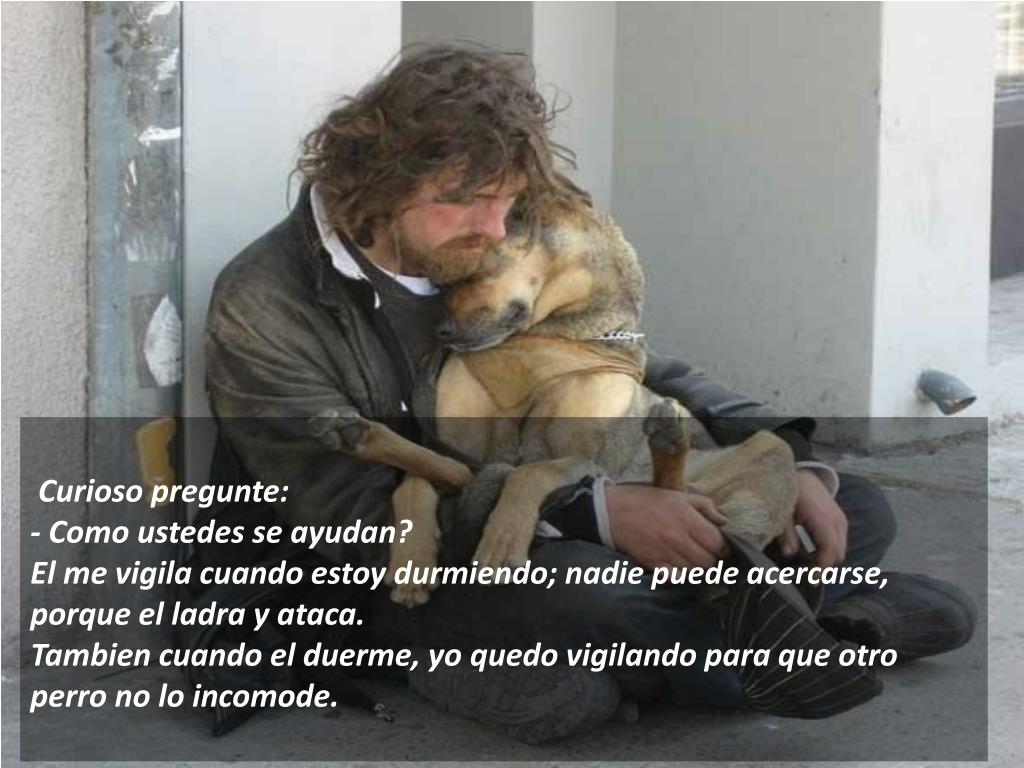 Curioso pregunte: - Como ustedes se ayudan? El me vigila cuando estoy durmiendo; nadie puede acercarse, porque el ladra y ataca. Tambien cuando el duerme, yo quedo vigilando para que otro perro no lo incomode.
