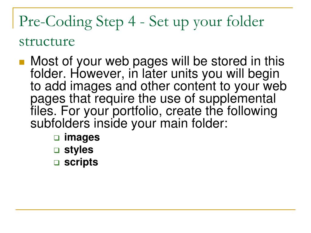 Pre-Coding Step 4 - Set up your folder structure • Most of your web pages will be stored in this folder. However, in later units you will begin to add images and other content to your web pages that require the use of supplemental files. For your portfolio, create the following subfolders inside your main folder: • images • styles • scripts