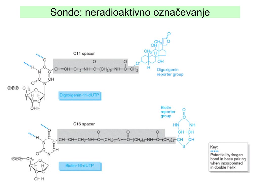 Sonde Sonde so označene ssDNA ali RNA, ki so vsaj delno komplementarne zaporedju, ki ga iščemo. Uporabljamo jih pri tehnikah prenosa (blotting) in pri študijah celic in situ. vrste označevanja: detekcija: radioaktivno (32P, 35S, 125I, 3H) avtoradiografija, števci biotin preko avidina/steptavidina encimi (alk.fosfataza, hrenova peroksidaza) test aktivnosti kemoluminiscenca luminometer, film fluorescenca fluorimetri, mikroskopija antigeni protitelesa
