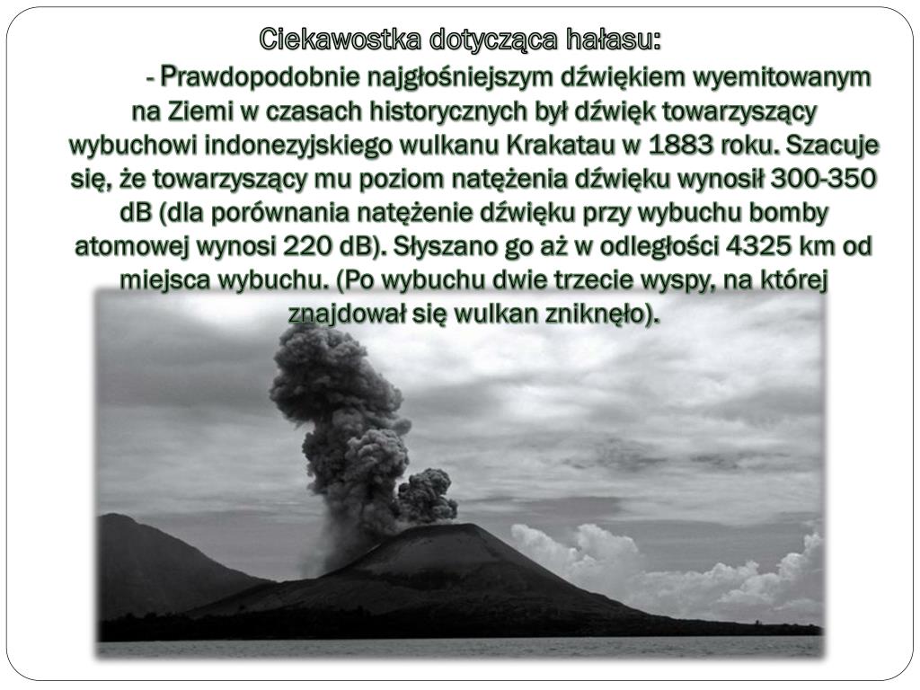 Ciekawostka dotycząca hałasu: - Prawdopodobnie najgłośniejszym dźwiękiem wyemitowanym na Ziemi w czasach historycznych był dźwięk towarzyszący wybuchowi indonezyjskiego wulkanu Krakatau w 1883 roku. Szacuje się, że towarzyszący mu poziom natężenia dźwięku wynosił 300-350 dB (dla porównania natężenie dźwięku przy wybuchu bomby atomowej wynosi 220 dB). Słyszano go aż w odległości 4325 km od miejsca wybuchu. (Po wybuchu dwie trzecie wyspy, na której znajdował się wulkan zniknęło).