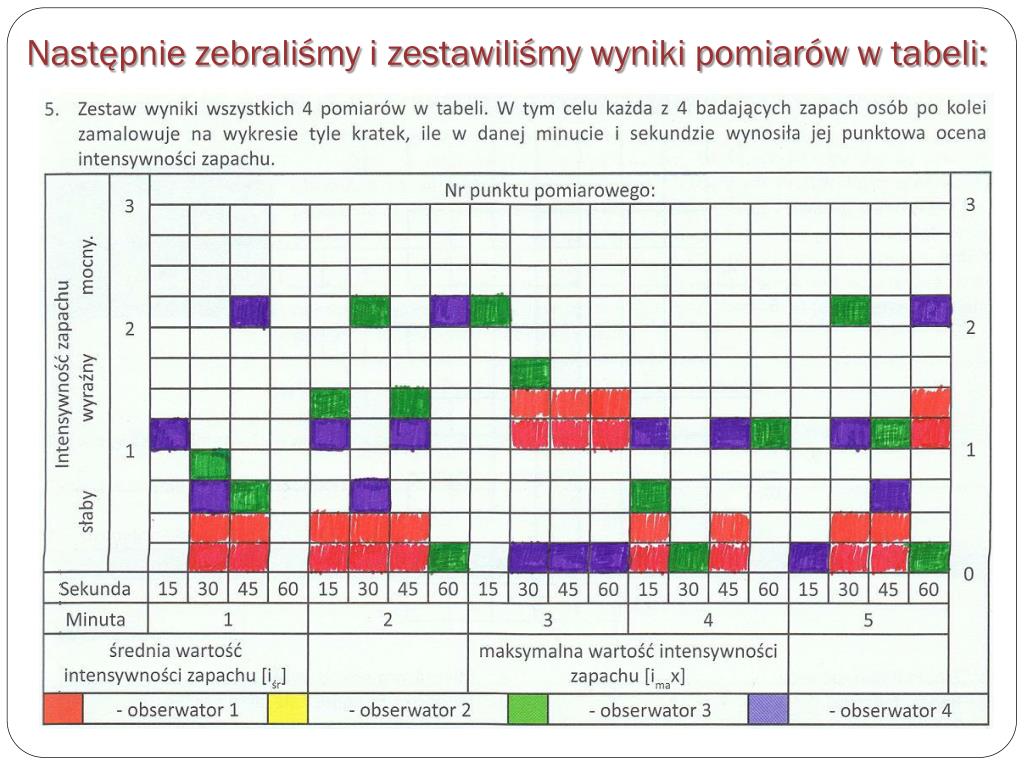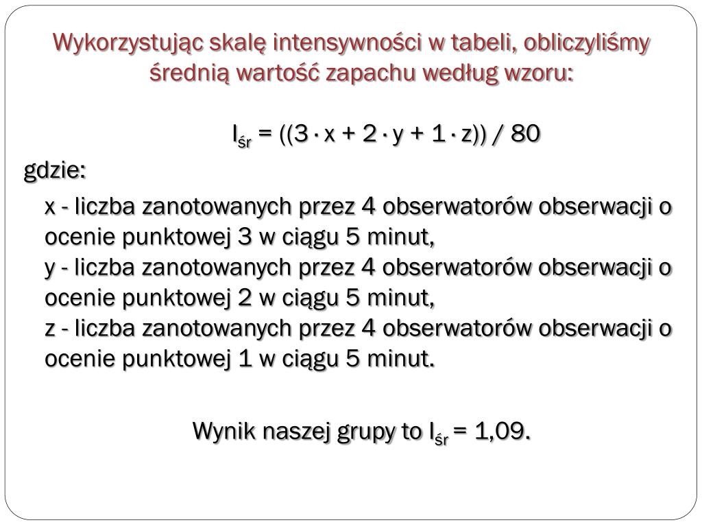 Wykorzystując skalę intensywności w tabeli, obliczyliśmy średnią wartość zapachu według wzoru:Iśr = ((3 · x + 2 · y + 1 · z)) / 80 gdzie: x - liczba zanotowanych przez 4 obserwatorów obserwacji o ocenie punktowej 3 w ciągu 5 minut,y - liczba zanotowanych przez 4 obserwatorów obserwacji o ocenie punktowej 2 w ciągu 5 minut,z - liczba zanotowanych przez 4 obserwatorów obserwacji o ocenie punktowej 1 w ciągu 5 minut. Wynik naszej grupy to Iśr= 1,09.