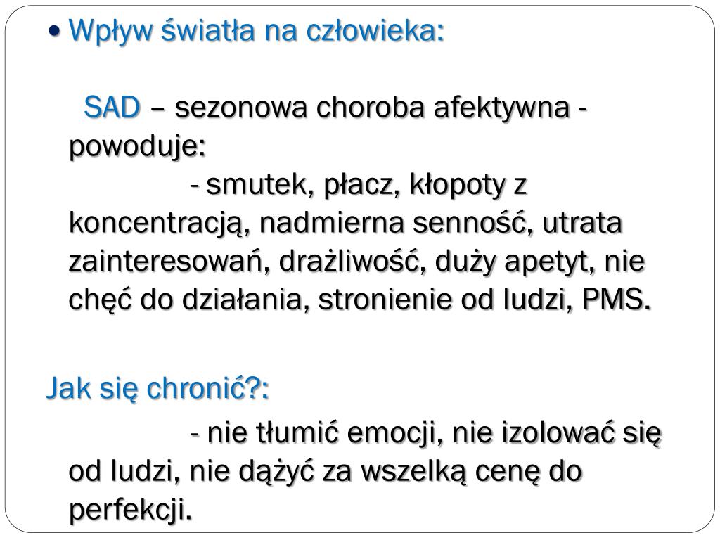 Wpływ światła na człowieka:SAD – sezonowa choroba afektywna - powoduje: - smutek, płacz, kłopoty z koncentracją, nadmierna senność, utrata zainteresowań, drażliwość, duży apetyt, nie chęć do działania, stronienie od ludzi, PMS. Jak się chronić?: - nie tłumić emocji, nie izolować się od ludzi, nie dążyć za wszelką cenę do perfekcji.
