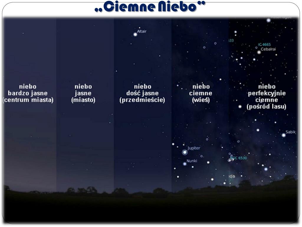 „Ciemne Niebo” Problemy ze sztucznym światłem w Polsce stają się coraz bardziej uciążliwe już nie tylko dla mieszkańców dużych aglomeracji, ale również ludzi zamieszkujących nawet małe wsie i miasteczka. Szczególnie problem ten zauważają obserwatorzy nocnego nieba oraz nocnej fauny, publikując coraz bardziej niepokojące informacje na różnorodnych forach internetowych, fachowych periodykach, w organizacjach tematycznych, przy okazji różnych imprez naukowych itp. Jednocześnie brak norm polskich regulujących zanieczyszczenie światłem w połączeniu z niewłaściwą polityką oświetlenia ulic (błędne przekonanie, że czym większa strata energii tym większe zyski dla elektrowni) spowodowały, że różne środowiska społeczne postanowiły zrobić pierwsze kroki w kierunku poprawny stanu nocnego nieba nad Polską.