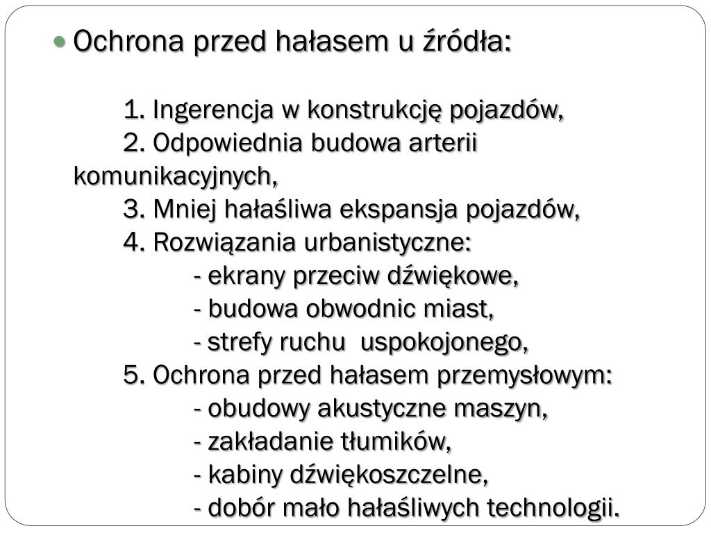 Ochrona przed hałasem u źródła: 1. Ingerencja w konstrukcję pojazdów, 2. Odpowiednia budowa arterii komunikacyjnych, 3. Mniej hałaśliwa ekspansja pojazdów, 4. Rozwiązania urbanistyczne: - ekrany przeciw dźwiękowe, - budowa obwodnic miast, - strefy ruchu uspokojonego, 5. Ochrona przed hałasem przemysłowym: - obudowy akustyczne maszyn, - zakładanie tłumików, - kabiny dźwiękoszczelne, - dobór mało hałaśliwych technologii.