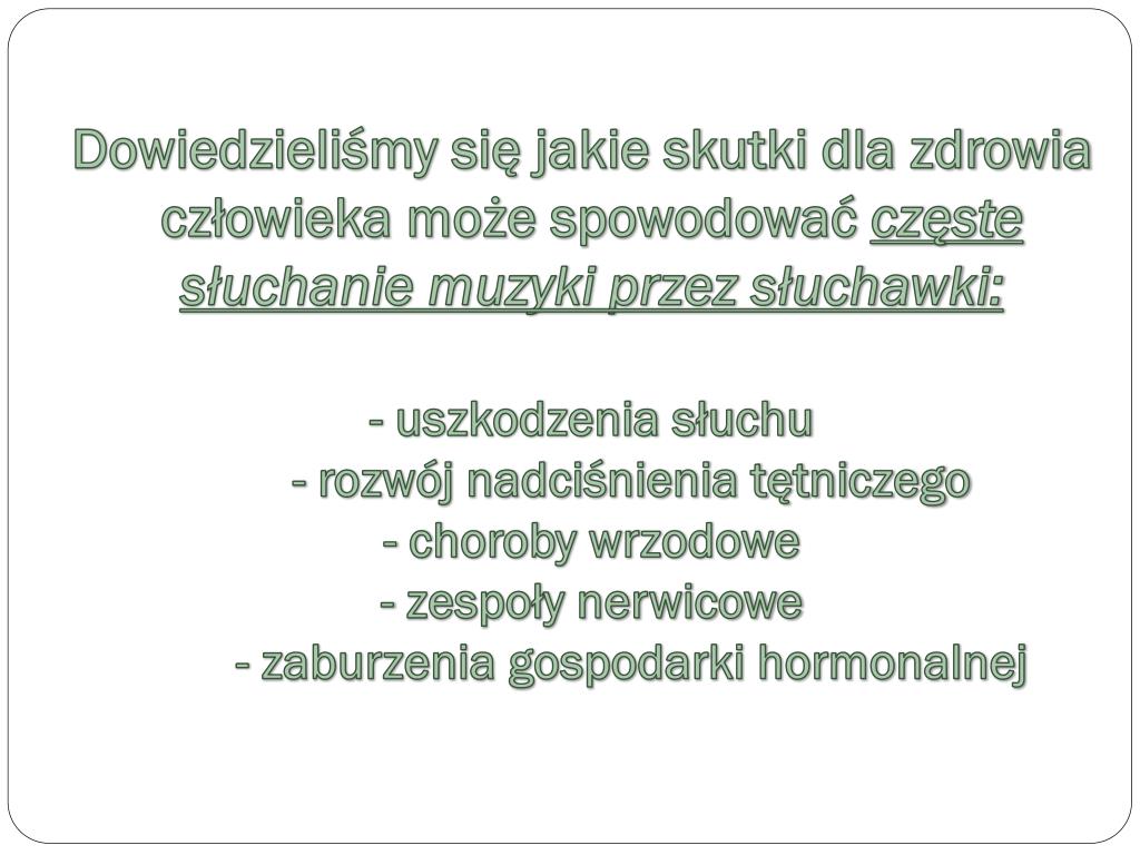 Dowiedzieliśmy się jakie skutki dla zdrowia człowieka może spowodować częste słuchanie muzyki przez słuchawki:- uszkodzenia słuchu - rozwój nadciśnienia tętniczego- choroby wrzodowe- zespoły nerwicowe - zaburzenia gospodarki hormonalnej