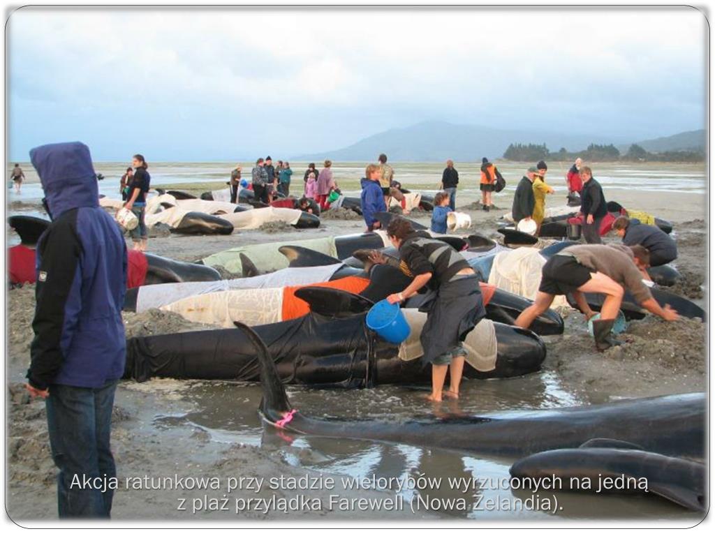 Akcja ratunkowa przy stadzie wielorybów wyrzuconych na jedną z plaż przylądka Farewell (Nowa Zelandia).