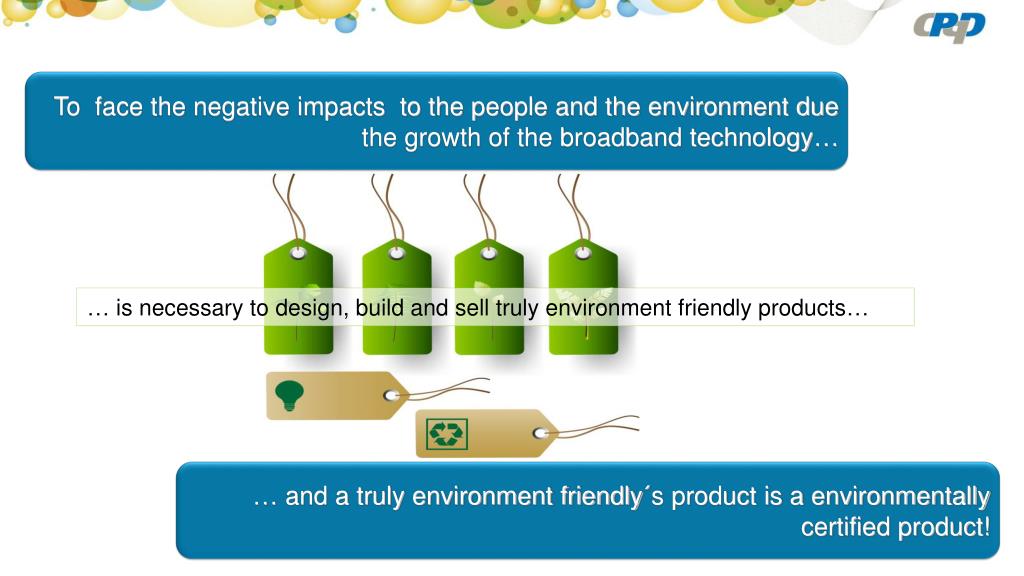 To face the negative impacts to the people and the environment due the growth of the broadband technology… … is necessary to design, build and sell truly environment friendly products… … and a truly environment friendly´s product is a environmentally certified product!