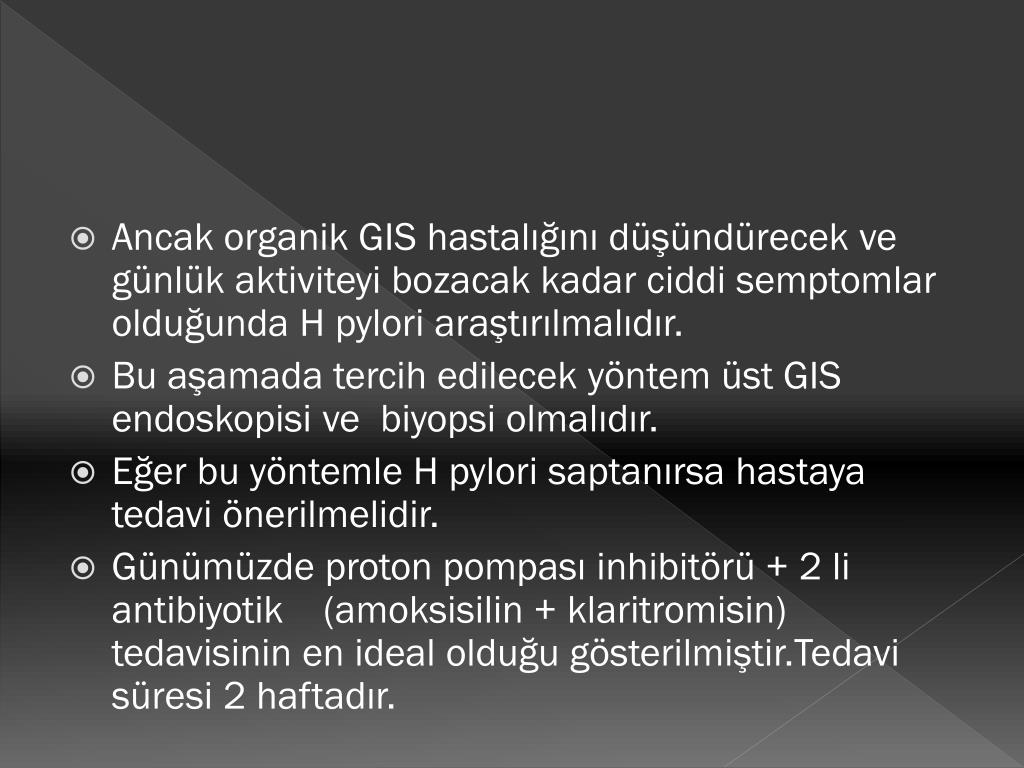 Ancak organik GIS hastalığını düşündürecek ve günlük aktiviteyi bozacak kadar ciddi semptomlar olduğunda H pylori araştırılmalıdır. • Bu aşamada tercih edilecek yöntem üst GIS endoskopisi ve biyopsi olmalıdır. • Eğer bu yöntemle H pylori saptanırsa hastaya tedavi önerilmelidir. • Günümüzde proton pompası inhibitörü + 2 li antibiyotik (amoksisilin + klaritromisin) tedavisinin en ideal olduğu gösterilmiştir.Tedavi süresi 2 haftadır.