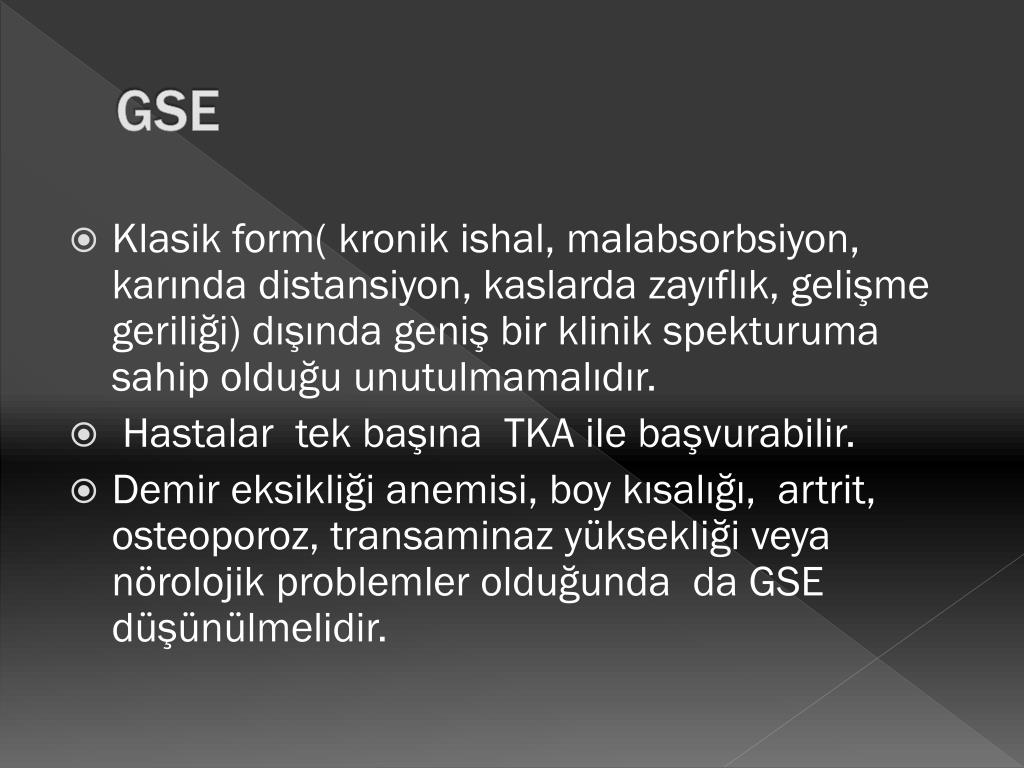 GSE • Klasik form( kronik ishal, malabsorbsiyon, karında distansiyon, kaslarda zayıflık, gelişme geriliği) dışında geniş bir klinik spekturuma sahip olduğu unutulmamalıdır. • Hastalar tek başına TKA ile başvurabilir. • Demir eksikliği anemisi, boy kısalığı, artrit, osteoporoz, transaminaz yüksekliği veya nörolojik problemler olduğunda da GSE düşünülmelidir.