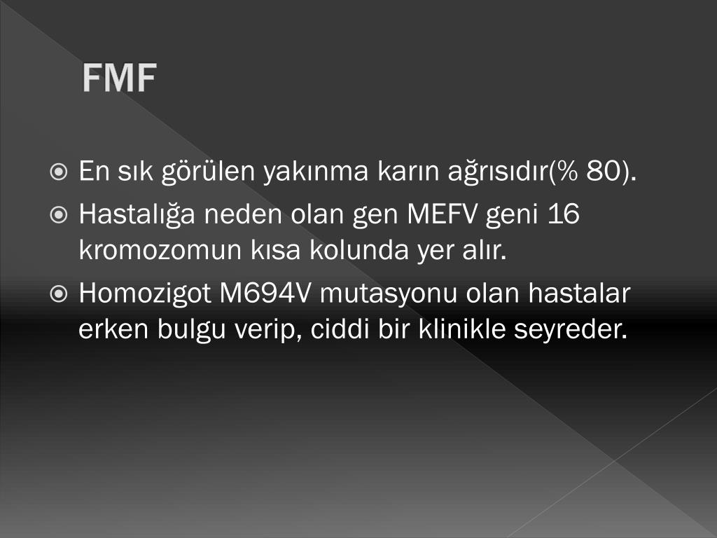 FMF • En sık görülen yakınma karın ağrısıdır(% 80). • Hastalığa neden olan gen MEFV geni 16 kromozomun kısa kolunda yer alır. • Homozigot M694V mutasyonu olan hastalar erken bulgu verip, ciddi bir klinikle seyreder.